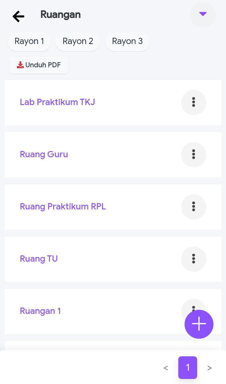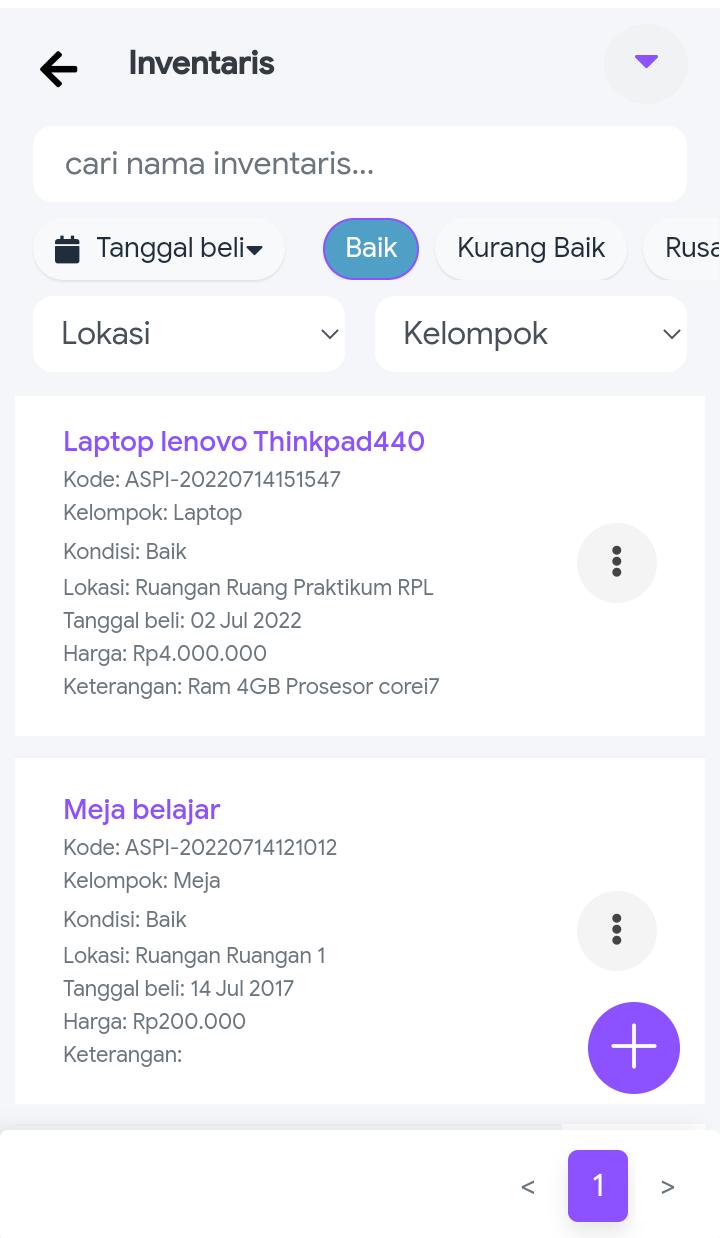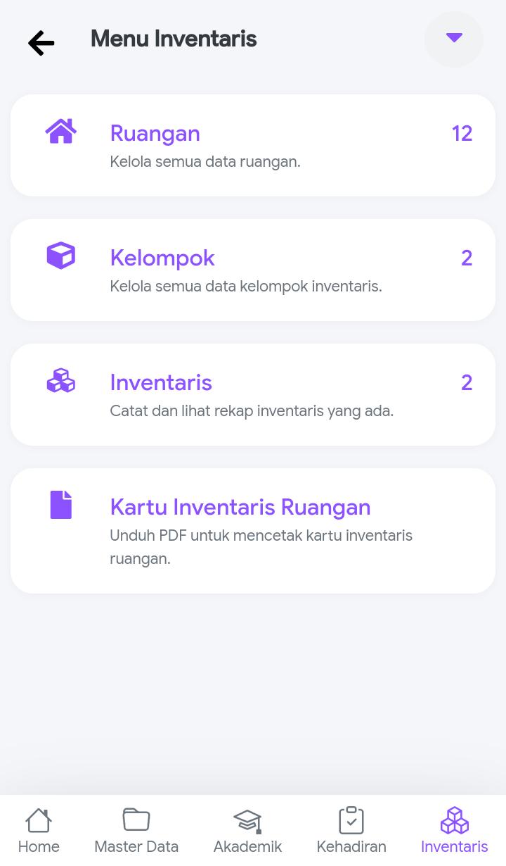 Di dalam Inventaris terdapat Fitur seperti Ruangan, Kelompok, Inventaris dan KIR.